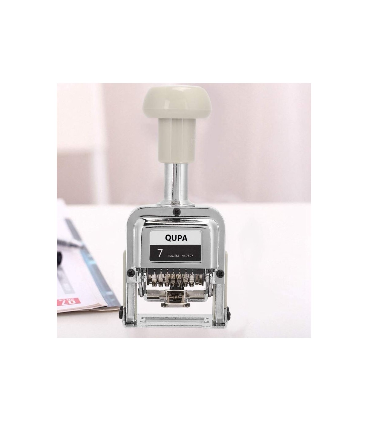 دستگاه شماره زن دستی Qupa مدل 7507 از بدنه فلزی بسیار مقاوم ساخته شده و دارای 7 رفم اعداد فارسی می باشد. این دستگاه برای شماره زنی انواع قبوض، فاکتور، فیش و رسید های تحویل کالا و ... قابل استفاده است. یک عدد جوهر، دو عدد پد، و یک قلم مخصوص جهت تعویض و تنظیم ارقام شماره زن همراه دستگاه می باشد.