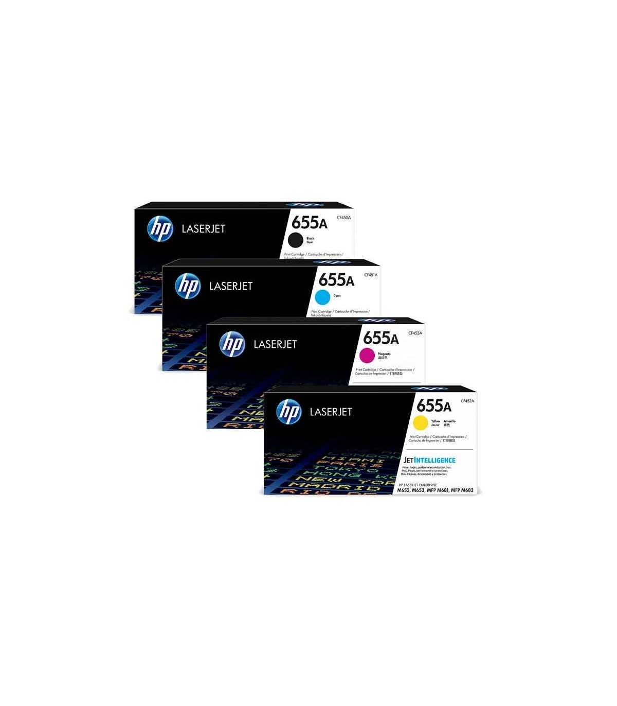 ست کارتریج لیزری رنگی اچ پی hp 655A - طرح با کدهای فنی CF450A, 451A, 452A, 453A دارای عملکرد چاپ تا 12500 برگ برای چاپ سیاه و سفید و تا 10500 برگ برای چاپ صفحه های رنگی است. این کارتریج در دستگاههای پرینتر اچ پی مدل های زیر قابل استفاده است:
